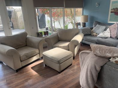 Two extra wide beige armchairs and pouffe