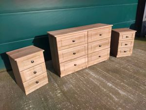 CHEST OF DRAWERS AND TWO BEDSIDE LOCKERS