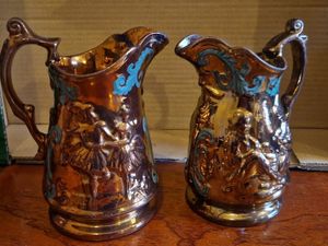 Pair of Genuine Antique Staffordshire Copper Lustre Jugs (c.1850)