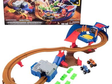 Supercharge Speedway Playset + 2 Monster Jam Trucks (Megalodon and El Toro Loco 1:64 Scale Die-Cast Monster Trucks) Kids Toys